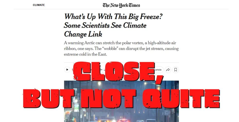 Alarmisten herhalen dit als een mantra in vrijwel elk artikel dat over het weer of het klimaat gaat, en het is net zo onbewezen als de beweringen die de NYT aanhaalt dat klimaatverandering de polaire vortex minder stabiel maakt. Er bestaat geen legitieme wetenschappelijke consensus dat de bescheiden opwarming van de afgelopen eeuw grotendeels wordt veroorzaakt door het gebruik van fossiele brandstoffen of catastrofale gevolgen met zich meebrengt.