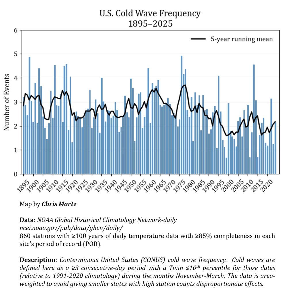 Uit openbaar beschikbare gegevens over dodelijke koudegolven in de Verenigde Staten blijkt dat deze in de loop van de tijd minder frequent voorkomen, niet vaker. De winters in de jaren 1890, 1910 en 1970 waren aanzienlijk strenger dan nu (zie onderstaande figuur).