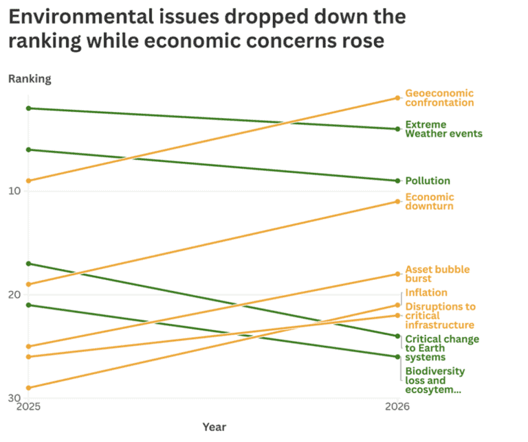 Maar de tijden zijn wel degelijk veranderd. Het WEF zelf likt zijn wonden. Schwab werd op basis van vage beschuldigingen weggestuurd, de werkelijke reden voor zijn vertrek blijft onduidelijk. De softe slogan dit jaar verraadt dat de mondiale elite zich in ieder geval publiekelijk wat op de vlakte wil houden. En over klimaatverandering praat het WEF steeds minder. Dit blijkt ook uit de jaarlijkse peiling onder 1300 ‘experts’ over wat zij zien als de grootste risico’s voor de planeet.