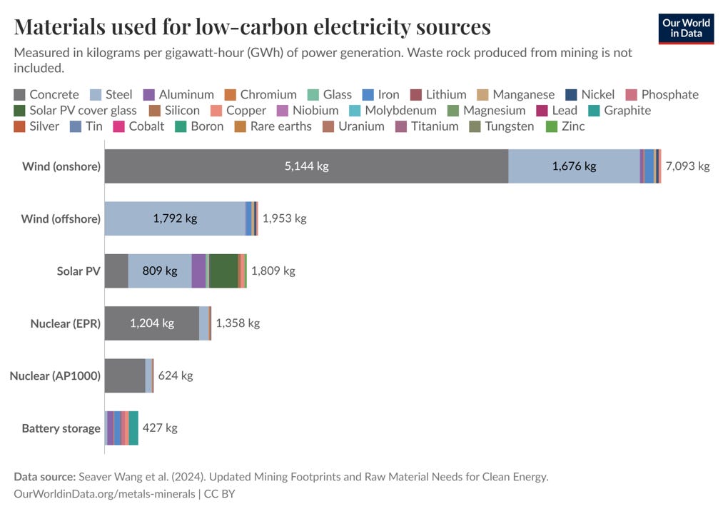 De argumenten in deze post gelden ook voor kernenergie, hoewel kernenergie minder grondstof-intensief is dan wind- en zonne-energie, plus batterijopslag. Bron: Our World in Data.