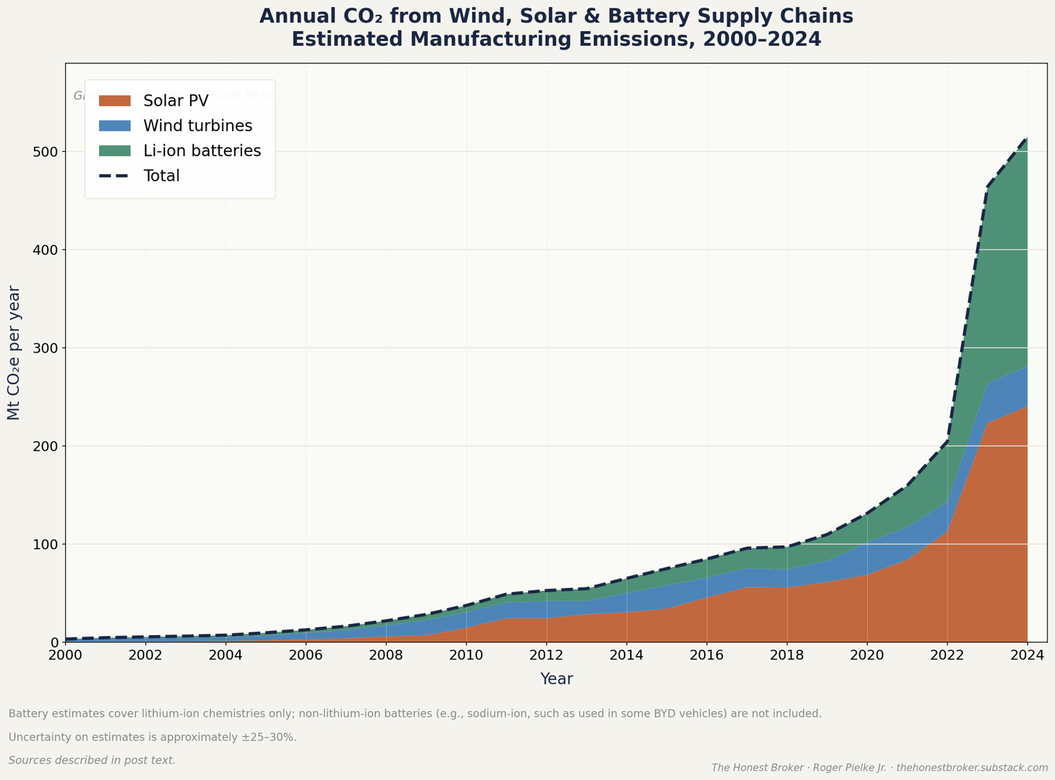 De onderstaande figuur toont een schatting van de CO₂-uitstoot van de toeleveringsketens voor de productie van nieuwe wind-, zonne- en batterijcapaciteit. De jaarlijkse uitstoot is gestegen van ~4 Mt in 2000 tot ~470 Mt in 2023 – ongeveer 1,3 procent van de wereldwijde energie-gerelateerde CO₂, en vergelijkbaar met de totale jaarlijkse uitstoot van Zuid-Korea of Canada. Die groei is puur een volume-effect: de koolstofintensiteit van de productie per GW is aanzienlijk gedaald, maar de absolute uitstoot is gestegen omdat de schaal van de implementatie veel sneller is gegroeid dan de intensiteit is afgenomen.