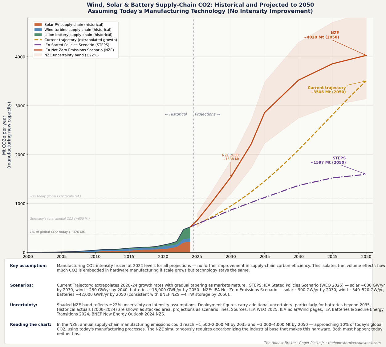 - Opmerkingen bij de grafieken: het historische cijfer (2000–2024) toont de geschatte jaarlijkse CO2-uitstoot door de productie van nieuwe wind-, zonne- en batterijcapaciteit: jaarlijkse toevoegingen vermenigvuldigd met de CO2-intensiteit van de productie, afgeleid van gepubliceerde LCA-ervaringscurves. Bronnen: Louwen et al. 2016 (Nature Communications); NREL LCA Harmonization 2012/2024; IEA Solar PV Supply Chains 2022; Emilsson & Dahllöf 2019; PNAS Nexus 2023 (Llamas-Orozco et al.); Peiseler et al. 2024 (Nature Communications). De onzekerheid over de intensiteitsschattingen bedraagt ongeveer ±25–30%. De cijfers hebben betrekking op emissies in de toeleveringsketen die voortkomen uit verbranding; koolstof uit petrochemische grondstoffen (epoxyharsen, kabelisolatie, achterplaten, smeermiddelen) is niet meegerekend en voegt waarschijnlijk 5–12% toe aan de getoonde waarden. Het prognosecijfer past de ‘frozen technology’-baseline toe die is geïntroduceerd in Pielke, Wigley & Green, Nature452, 531 (2008) — waarbij de productie-intensiteit constant wordt gehouden op het niveau van 2024 — op drie IEA-implementatiescenario’s: Stated Policies (WEO 2025), Net Zero Emissions en een extrapolatie van het huidige traject. Vergelijkingen van de uitstoot per land zijn afkomstig uit EDGAR 2025 en IEA CO2 Emissions in 2023. Capaciteitsgegevens: IEA-PVPS/IRENA (zonne-energie); GWEC/WWEA (wind); IEA Global EV Outlook 2024 (batterijen).