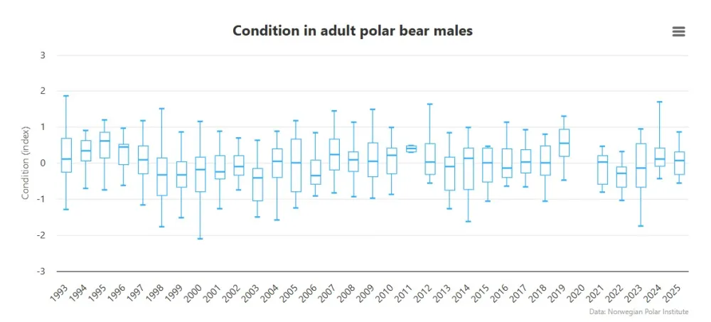 Hieronder staat een grafiek van de Noorse monitoring-website die elk jaar gegevens over de ijsberen op Spitsbergen publiceert. Deze grafiek toont de lichamelijke conditie van volwassen mannetjes tot 2025 – zeven jaar na de einddatum van het onderzoek van Aars uit 2026.