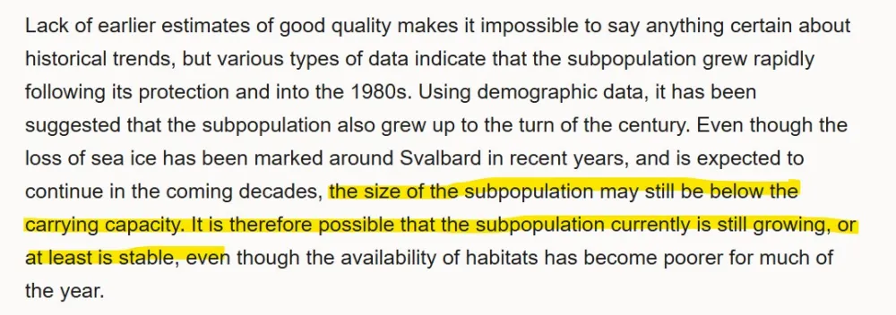 “Door het ontbreken van eerdere schattingen van goede kwaliteit is het onmogelijk om iets met zekerheid te zeggen over historische trends, maar verschillende soorten gegevens wijzen erop dat de subpopulatie na de bescherming ervan en tot in de jaren tachtig snel is gegroeid. Op basis van demografische gegevens wordt verondersteld dat de subpopulatie ook tot aan de eeuwwisseling is gegroeid. Hoewel het zee-ijs rond Spitsbergen de afgelopen jaren aanzienlijk is afgenomen en deze afname naar verwachting de komende decennia zal doorzetten, ligt de omvang van de subpopulatie mogelijk nog steeds onder de draagkracht. Het is daarom mogelijk dat de subpopulatie momenteel nog steeds groeit, of in ieder geval stabiel is, ook al is de beschikbaarheid van habitat gedurende een groot deel van het jaar afgenomen.”