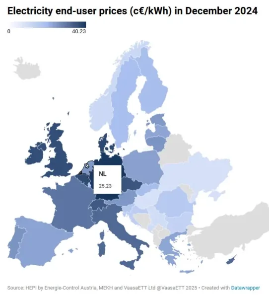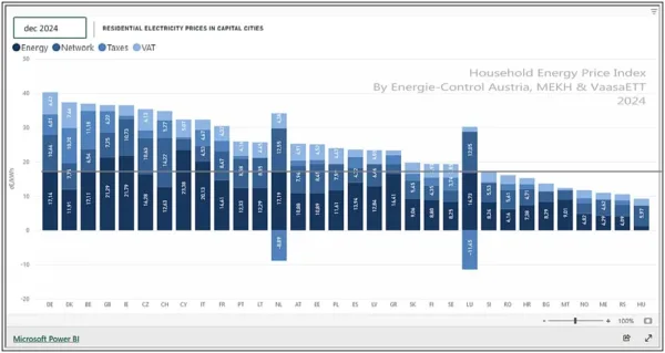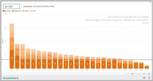 HEPI , Household Energy Price Index for Europe, is een samenwerkingsverband van een drietal energiebureaus, te weten het Finse VasaaETT, Energie-Control Austria en de Hungarian Energy and Public Utility Regulatory Authority (MEKH). HEPI brengt elke maand een rapport uit met een overzicht van de prijzen van gas en elektriciteit zoals betaald in de hoofdsteden van de 27 EU lidstaten plus het Verenigd Koninkrijk en Oekraïne. Daarin staan opmerkelijke feiten over de gas- en elektriciteitsprijzen. Vandaag een overzicht van de Europese energieprijzen voor de maand december 2024.