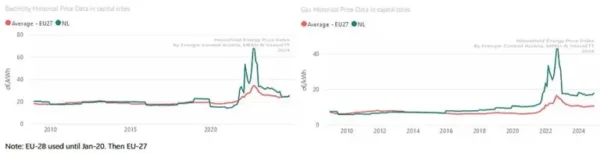 Tot slot toont figuur 5 de ontwikkeling in de tijd van de elektriciteits- en gasprijzen van Nederland en de EU. Waar we voor wat betreft de elektriciteitsprijzen de afgelopen maanden weer netjes in het EU-gelid lopen, toont de rechter grafiek dat Nederlanders vergeleken met de EU absurd veel voor het aardgas betalen. Voor een oplossing van de hoge gasprijzen in ons land moeten we dus echt in Den Haag zijn en niet in Groningen. Kom op regering, doe daar eens wat aan!