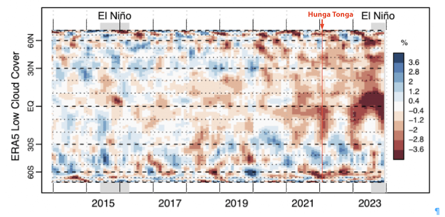 Hoewel Minobe et al. (2025) de betrokkenheid van ENSO (El Niño–Southern Oscillation) bij wat er gebeurde, ondersteunen, leveren zij nog meer tegenargumenten.13 Ten eerste tonen zij aan dat de buitengewone opwarming van 2023 begon in de Zuidelijke Oceaan in november 2022, vier maanden vóór de opwarming van de tropische Grote Oceaan en het begin van El Niño. Een gevolg kan niet voorafgaan aan de oorzaak. Ten tweede tonen zij aan dat de energie-onbalans op aarde tussen 2022 en 2023 meer dan 75 % groter was dan tijdens het begin van vergelijkbare recente El Niño-gebeurtenissen. Deze ongekende gebeurtenis had eerst invloed op de bovenste laag van de atmosfeer en begon in 2022. Bovendien wijst de reeks atmosferische en oceanische indicatoren die zijn opgenomen in de multivariate El Niño-index (MEI) erop dat de El Niño-gebeurtenis van 2023 niet bijzonder intens was. Een El Niño-gebeurtenis zoals vele andere, kan geen ongekende gebeurtenis veroorzaken.