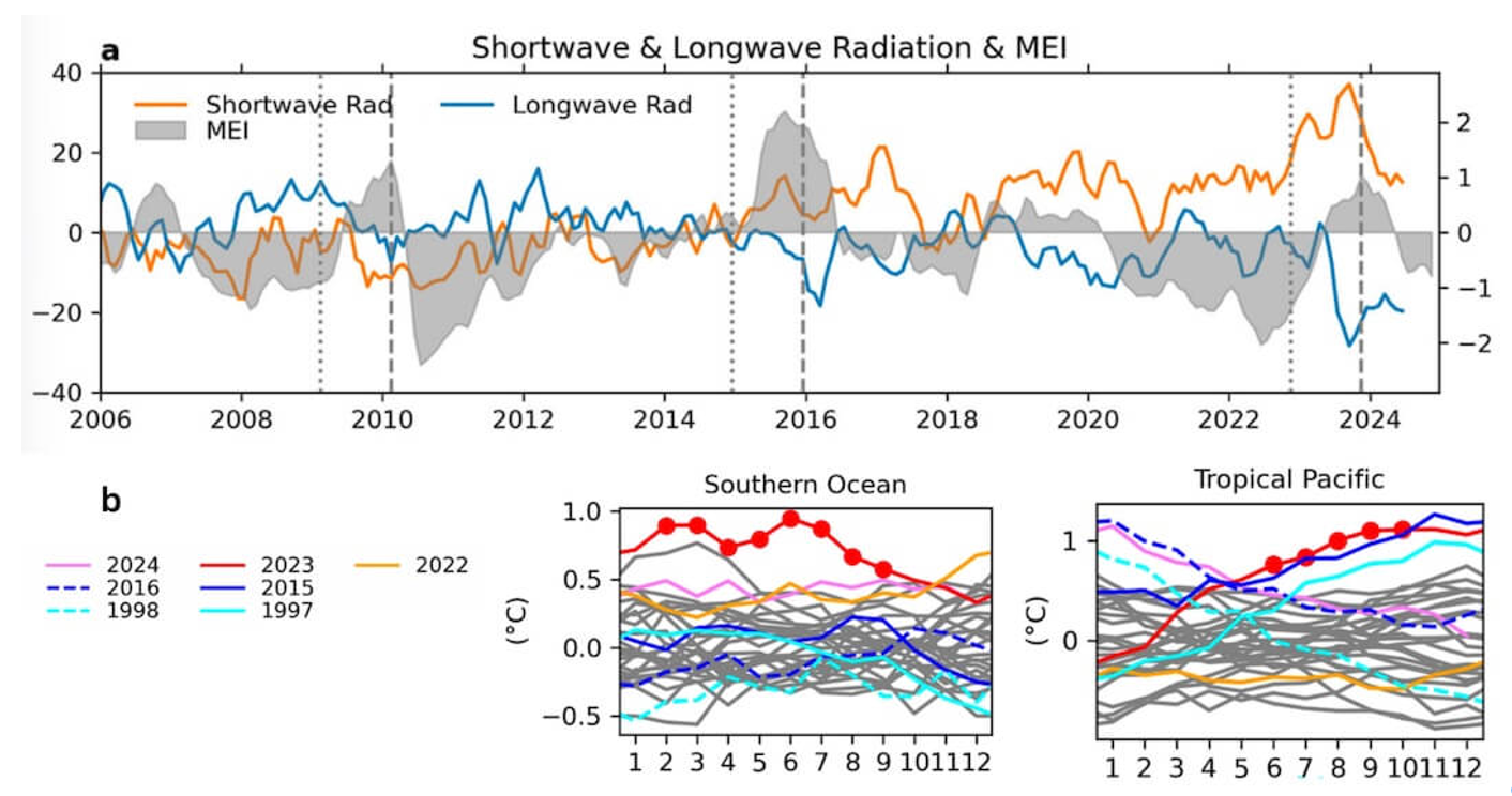 Figuur 3. a) Wereldwijde afwijkingen in de atmosfeer van korte golf-straling (neerwaarts) en langegolf-straling (neerwaarts) en multivariate ENSO-index (MEI). In 2022 begon een sterke toename van de kortegolf-straling. De opwarming van de aarde veroorzaakte in 2023 een sterke toename van opwaartse langegolf-straling, voorafgaand aan een El Niño van gemiddelde intensiteit. b) Maandelijkse tijdreeks van afwijkingen in de temperatuur van het zeeoppervlak in geselecteerde regio’s van de Zuidelijke Oceaan en de tropische Grote Oceaan. De afwijking begon rond november 2022 in de Zuidelijke Oceaan, ongeveer vier maanden voordat El Niño in de Grote Oceaan begon.13