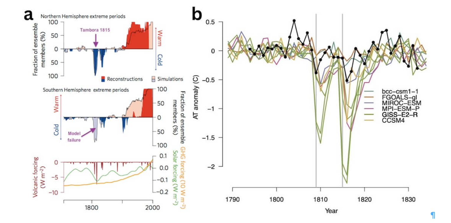 Figuur 4. Het onvermogen van modellen om de klimaateffecten van grote vulkaanuitbarstingen te reproduceren, doet twijfels rijzen over de betrouwbaarheid van hun diagnose dat de uitbarsting van Hunga Tonga weinig effect had op het oppervlakteklimaat. a) Alle modellen reproduceren een afkoelend effect op het zuidelijk halfrond als gevolg van de Tambora-uitbarsting in 1815, maar dit effect wordt niet ondersteund door bewijs.16 b) De modellen overdrijven de afkoeling van de zeetemperaturen als gevolg van de Tambora-uitbarsting in 1815 en een eerdere uitbarsting in 1809 sterk. De waarnemingen (in het zwart) laten een veel kleinere afkoeling zien.17