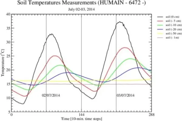 Figuur 12 toont het verloop van de bodemtemperatuur op verschillende diepten gedurende 2 etmalen op het KMI station Humain. Op 0 cm diepte verloopt de temperatuur overdag vrijwel gelijk aan de instraling. Naarmate de diepte toeneemt neemt de maximum temperatuur af, en tegelijk zie je de top naar rechts verschuiven. Op 20 cm diepte ligt de top rond 21:30 uur, 9 uur later dan het moment van maximum instraling. Op diepte van 100 cm lijkt er geen invloed meer van opwarming, maar dat is schijn: