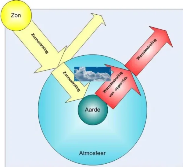 De zon straalt kortgolvige straling uit, de aarde absorbeert die energie en wordt daardoor warm. Op zijn beurt straalt de aarde daardoor energie naar buiten uit. Omdat de temperatuur van de aarde veel lager is dan de buitenzijde van de zon straalt de aarde energie uit in de vorm van langgolvige straling, warmtestraling. Voor de hoeveelheid energie die de aarde ontvangt en zelf uitstraalt maakt dat niets uit: de aarde ontvangt op langere termijn net zoveel energie als hij uitstraalt: ‘What comes in must go out’, de populaire vertaling van de Eerste Wet van de Thermodynamica.
