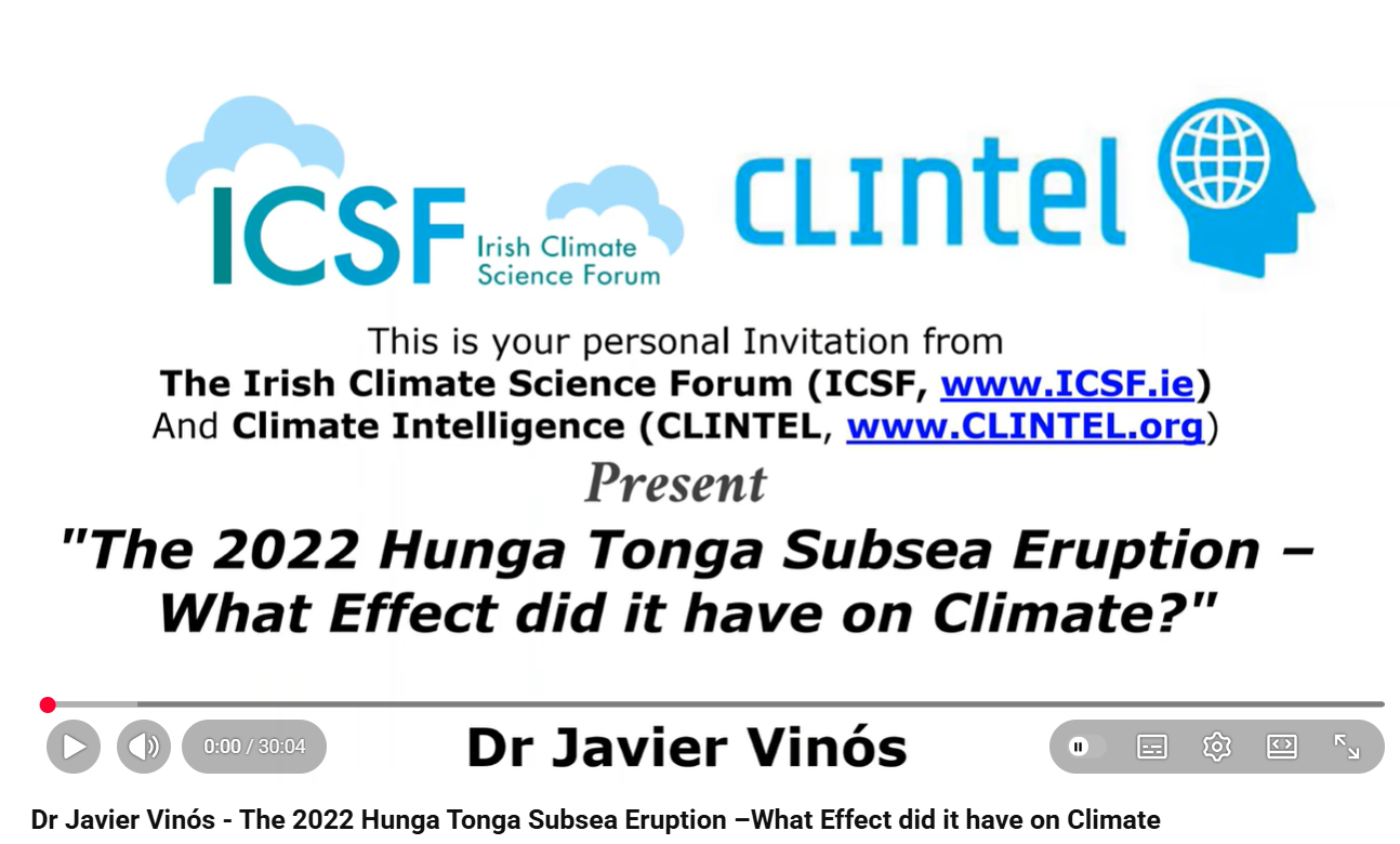 Bekijk hieronder de lezing van Dr. Vinós: Dr Javier Vinós – The 2022 Hunga Tonga Subsea Eruption –What Effect did it have on Climate?