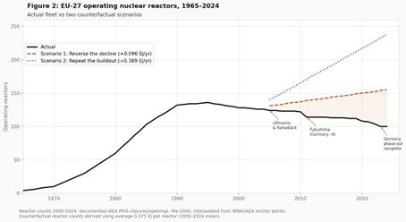 In een fascinerend artikel op zijn Substack-pagina The Honest Broker laat de Amerikaanse onderzoeker Roger Pielke Jr. met wat eenvoudige berekeningen zien hoezeer de EU de afgelopen decennia de plank heeft misgeslagen met haar energiebeleid, dat er hoegenaamd op gericht was om CO2 te reduceren. Hij werkt daarbij met twee scenario’s. In het eerste scenario zet hij de afname aan kerncentrales in Europa tussen 2000 en 2024 om in een even sterke toename. In het tweede scenario groeit het aantal kerncentrales even sterk als in de periode tussen 1970 en 1990, toen Frankrijk in rap tempo meer dan 50 centrales bouwde.