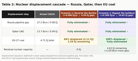 In beide scenario’s zouden we helemaal geen gas uit Rusland en Qatar meer nodig hebben gehad. In scenario 1, met lichte groei in kernenergie, zou ook 66 procent van het steenkoolgebruik zijn teruggedrongen en in scenario 2 zelfs ál het steenkoolgebruik. Er zou dan zelfs nog energie overblijven om ongeveer 129 miljard kuub gas te vervangen. Nederland gebruikt jaarlijks zo’n 30 tot 35 miljard kuub aardgas.