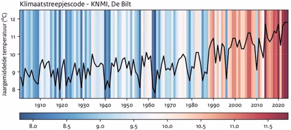 De kleuren variëren van donkerblauw (koude jaren) tot donkerrood (warme jaren). De trend is duidelijk: Nederland wordt warmer. In de eerste helft van de vorige eeuw zijn veel strepen blauw, wat betekent dat het toen koeler was. De laatste decennia zie je steeds meer rode strepen, omdat de temperaturen sneller stijgen. Dit komt vooral door menselijke activiteiten, zoals het verbranden van fossiele brandstoffen. De toename van temperatuur heeft gevolgen voor ons allemaal, zoals vaker hittegolven en meer zware regenbuien.”