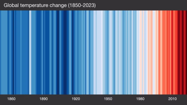 Die van-blauw-naar rood streepjes zijn bedacht door prof Ed Hawkins van de University of Reading. Figuur 2 toont de streepjescode volgens Hawking voor de aardse temperatuur van 1850-2023. Deze grafiek is gebaseerd op Hadcrut5 data (anomalieën), waarbij het temperatuurverschil tussen het koudste jaar (1904) en het warmste jaar (2023) ongeveer 1,5 °C. is. Identieke kleuren in de figuren 1 en 2 betekenen dus niet identieke temperaturen. Het is een soort elastische schaal, waarbij het donkerste blauw het koudste jaar vertegenwoordigt en het donkerste rood het warmste jaar. Jeugdjournaal-statistiek.