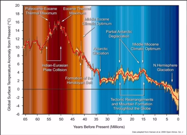 De rode lijn in figuur 3 is de aardse temperatuur (temperatuurproxy), afkomstig van Hansen et al., 2008. Met behulp van de data van Hansen is af te lezen dat het temperatuurverschil in de afgelopen 66 mln jaar méér dan 18 °C was, van het warmste streepje zo’n 51 mln jaar geleden tot het koudste streepje in het heden.