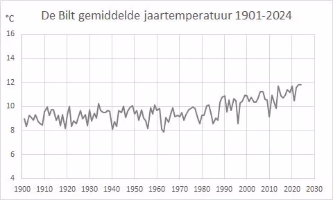 De grafiek van figuur 4 toont een temperatuursprong in 1989 (zie o.a. hier) en heeft daarna een vlak verloop tot 2013. Daarna stijgt de temperatuur weer. De jaren 2023 en 2024 waren inderdaad de warmste van de tijdreeks, met 11,8 °C. Maar in een artikel van 1 oktober 2024 liet ik zien dat het nogal uitmaakt op welke wijze men met de data omgaat. Dat artikel schreef ik naar aanleiding van een bericht in de Telegraaf dat ‘het regenrecord maar verbroken’ bleef worden. Dat bleek niet zo te zijn maar die conclusie van de krant was het gevolg van het feit dat we vaak in kalendermaanden en -jaren rekenen. Als je dat niet doet maar gebruik maakt van het voortschrijdend gemiddelde kan dat het beeld beïnvloeden.