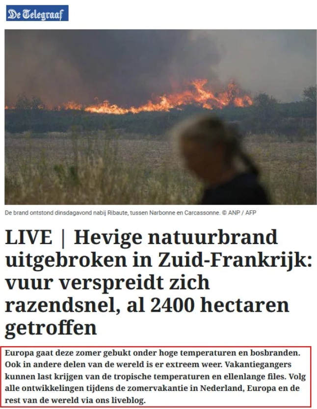 De eerste zin luidt: “Europa gaat deze zomer gebukt onder hoge temperaturen en bosbranden”. Is dat zo? Europa is groot, ik denk dat de dienstdoende journalist waarschijnlijk Zuid-Europa bedoeld heeft. Nu zijn in Zuid-Europa de zomerse temperaturen altijd hoog, dat trekt elk jaar miljoenen vakantiegangers aan. En bij mijn beste weten zijn de temperaturen daar deze zomer niet opvallend hoger dan andere jaren.