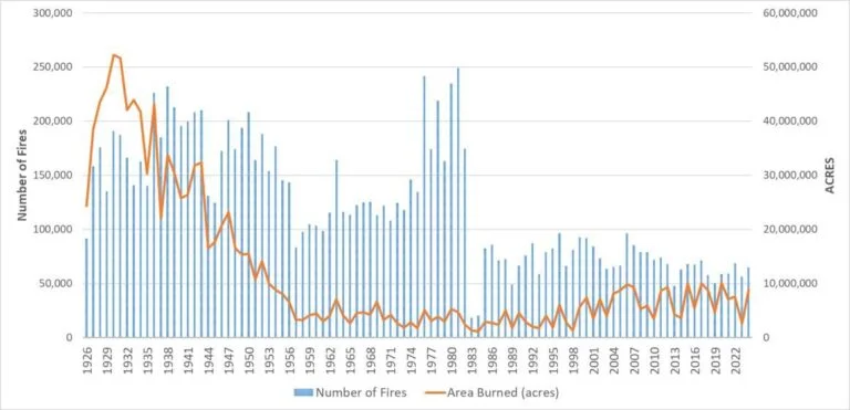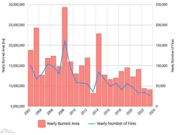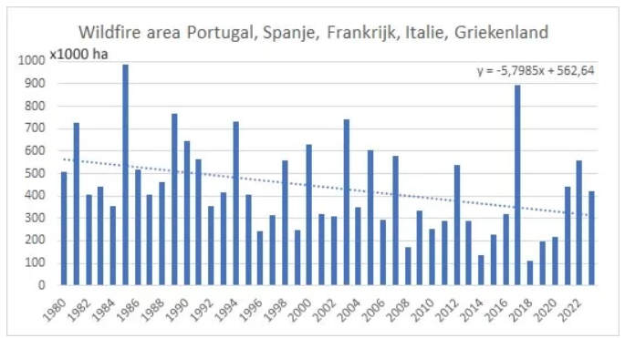 Figuur 2 is afkomstig van een artikel dat ik vorig jaar schreef over bosbranden in Zuid-Europa. De data lopen t/m 2023 en 2025 is nog niet voorbij, maar het zou me verbazen als 2025 een opvallend grote oppervlak wildfire gaat laten zien.