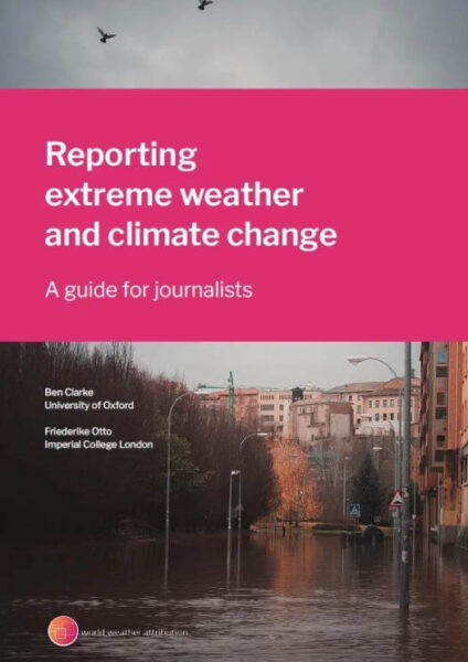These events often have widespread impacts on society, including the loss of crops and farmland, destruction of property, severe economic disruption and loss of life. Following an extreme event with severe impacts, a great deal of public interest is generated in its causes. Increasingly, the dominant question is: “Was this event caused by climate change?” This guide is intended to help journalists navigate this question.”