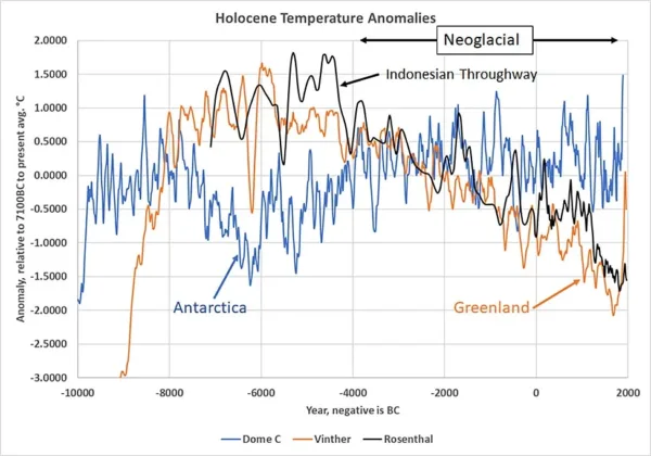 Figuur 1. Proxy-temperaturen voor het Holoceen van Antarctica (Dome C, Jouzel et al., 2007), Groenland (Vinther) en Indonesië (Rosenthal). De Neoglaciale klimaatperiode is gelabeld. Het is een temperatuurdaling op het noordelijk halfrond.