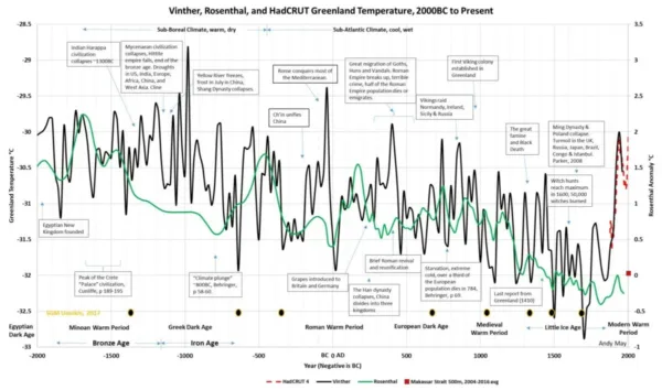 De Blytt-Sernander klimaatperioden (Schrøder, et al., 2004) worden bovenaan in figuur 2 aangegeven. Daaronder zijn de Vinther en Rosenthal proxy temperatuurmetingen uitgezet samen met belangrijke historische gebeurtenissen. De rode stippellijn rechts is een afgevlakte HadCRUT4 composiet van de zes bevolkte gridcellen (d.w.z. gridcellen met temperatuurwaarden) bij Groenland die voldoende gegevens hebben sinds 1850. De lijn werd verticaal aangepast aan de Vinthergegevens waar deze elkaar overlapten. Zowel de Vinther als de 20-jaar afgevlakte HadCRUT4 metingen laten een piek zien rond 1934. Het Rosenthal record is van 500 meter diepte in de Straat Makassar in Indonesië. Het rode kader is de gemiddelde temperatuur (op dezelfde diepte) van 2004-2016, afkomstig uit de mondiale oceaanklimatologiedatabase van de Universiteit van Hamburg (Gouretski, 2019).