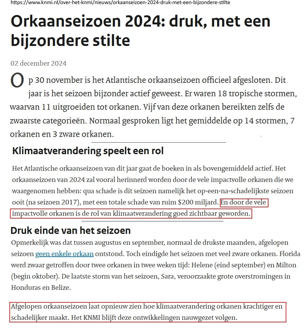 Bij gebrek aan ‘strong evidence’ lijkt het me daarom beter als het KNMI zijn bericht over het orkaanseizoen 2024 aanpast en de suggestieve verwijzingen naar klimaatverandering verwijdert. Misschien dat de journaals van NOS en RTL dan ook wat minder ‘hitsig’ worden in hun berichtgeving over tropische stormen?