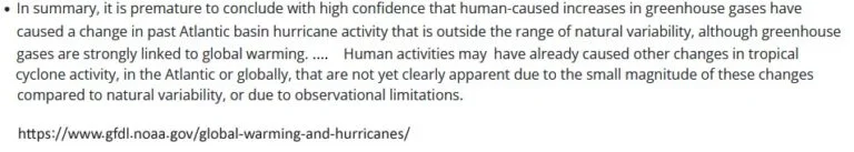 Als voorspellen zo ingewikkeld is, hoe serieus moet je dan de stelling van het KNMI nemen dat “… de rol van klimaatverandering is goed zichtbaar geworden”? De afdeling van NOAA (National Oceanic and Atmospheric Administration) die zich bezig houdt met tropische stormen (GFDL) schrijft in een recent bericht:
