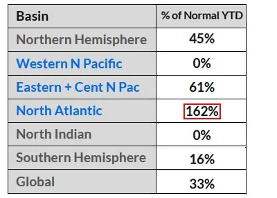 Bovenstaande tabel is afkomstig van de website van meteoroloog Dr. Ryan Maue, een bekende stormdeskundige uit Florida. De tabel toont in de tweede kolom (Current YTD) de totale cycloon-energie (ACE, Accumulated cyclone energy) per regio van 2024. Te zien is dat de ACE in het bekken North Atlantic in 2024 aanmerkelijk hoger was dan gemiddeld (Normal YTD). Dat was echter niet het geval in de overige bekkens Western N Pacific, Eastern + Cent N Pacific, North Indian en het Zuidelijk Halfrond.