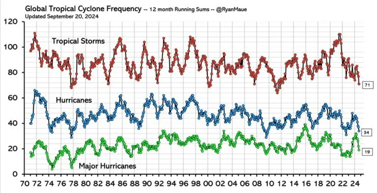 Er is de afgelopen maanden veel kabaal geweest over het opvallend vaak voorkomen van tropische wervelstormen in 2024. Zonder te twijfelen stelt het KNMI nadrukkelijk dat klimaatverandering daarbij een rol speelde: “… de rol van klimaatverandering is goed zichtbaar geworden”. Is dat wel zo? Rob de Vos duikt weer in de data.
