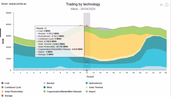 “Rond 12:30 uur lokale tijd in Spanje — enkele minuten vóór de instorting van het netwerk — werd 78% van de elektriciteit in het Iberisch systeem opgewekt uit hernieuwbare bronnen, waarvan bijna 60% afkomstig was van zonne-energie. Ter vergelijking: conventionele technologieën, zoals gas- en kerncentrales, leverden slechts zo’n 15% van de totale opwekking. Deze verdeling is niet ongebruikelijk in Spanje of Portugal, waar een hoog aandeel hernieuwbare opwekking normaal is op zonnige en winderige dagen.