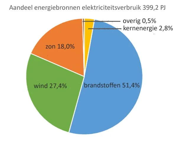 De grafiek van figuur 3 toont het aandeel van de diverse energiebronnen in het elektriciteitsverbruik in Nederland gemiddeld over het jaar 2024. Zon en wind namen 45,4% van de totale productie voor hun rekening, waarvan zonne-energie ‘slechts’ 18%. Maar bedenk dat dit een jaargemiddelde is, op een zonnige zomers dag kan de opwekking van elektriciteit door zon en wind groter worden dan de vraag naar elektriciteit. Wat dat voor gevolgen kan hebben ziet u hier: