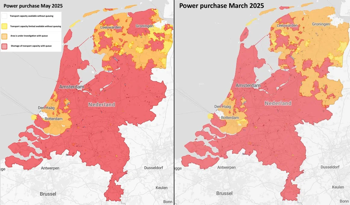 Figuur 6 links toont de huidige situatie aan de terugleverzijde van het net. Op een deel van de Randstad en zuidelijk Zeeland na kan er vrijwel nergens meer in Nederland stroom aan het net geleverd worden. Het net zit ook aan deze zijde bomvol. Let eens op het verschil met de situatie in maart 2025 (figuur 6 rechts): heel Noord-Holland heeft de kleur rood gekregen, zoals bijna heel Nederland die al heeft.