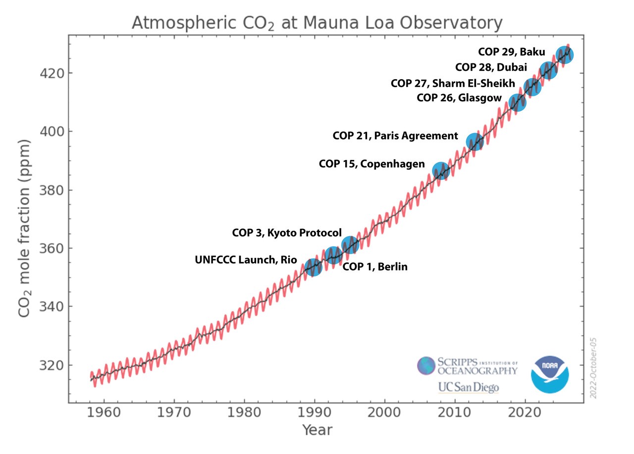 De CO2-toename sinds de eerste COP-conferenties.