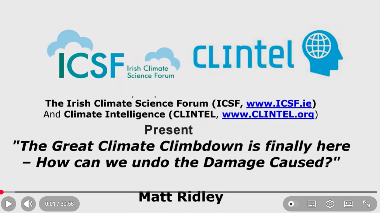 In het tijdschrift The Spectator verklaarde de Britse schrijver, journalist en zakenman Matt Ridley onlangs dat “de rage rond de opwarming van de aarde eindelijk, gelukkig, aan het uitsterven is. Om Monty Python te parafraseren: de klimaatpapegaai zit misschien nog wel vastgespijkerd aan zijn stokje op de COP-top in Belém, Brazilië – of op Harvard en op CNN – maar elders is hij dood.” Ridley stelde ook dat de uitspraken van Bill Gates, waarin hij toegaf dat de opwarming van de aarde “niet zal leiden tot de ondergang van de mensheid”, een belangrijke nagel aan de doodskist van de klimaatpaniek is. De afname van het klimaatalarmisme was het belangrijkste onderwerp in Ridleys ICSF/Clintel-lezing: “The Great Climate Climbdown” (1 april).