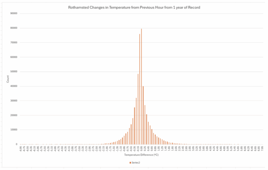 Op de controle-locatie in Rothamsted varieert het overgrote deel van de half miljoen metingen van minuut tot minuut, met individuele verschillen in een bereik tussen –0,15 en 0,25 °C. De meeste individuele veranderingen ten opzichte van het voorgaande uur lagen tussen –0,35 °C en 0,45 °C. En, zoals de onderstaande grafiek laat zien, vertoonden de meeste metingen aanzienlijk minder afwijking.