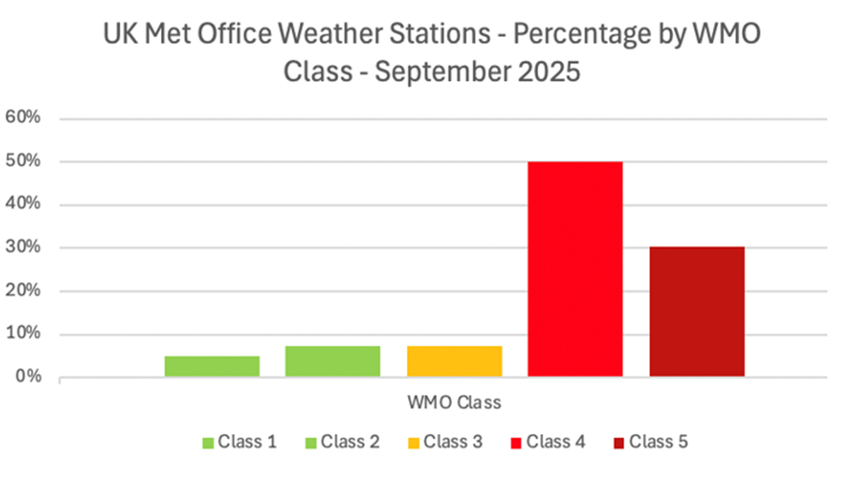 Het is nauwelijks een verrassing dat warmtepieken het temperatuur-meetprogramma van het Met Office in bijna het gehele landelijke netwerk ontsieren. Een recent verzoek om openbaarmaking van informatie door Daily Sceptic onthulde dat het aantal meetstations van de klassen 4 en 5 de afgelopen 18 maanden aanzienlijk is toegenomen en nu een schrikbarende 80,6% van het gehele netwerk van bijna 400 stations uitmaakt.