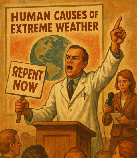 Klimaatpropaganda die erop gericht is om mensen bang te maken voor hun naderende ondergang door extreem weer, gaat meestal gepaard met een parallelle oproep om tot inkeer te komen. Het is niet overdreven om dit klimaatevangelisatie te noemen.