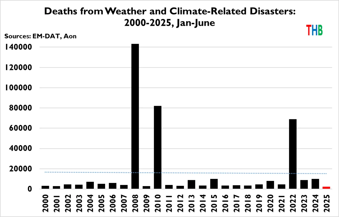 De sterfte door rampen in de eerste helft van 2025 is ook lager dan alle sterfgevallen in de tweede helft van deze eeuw.