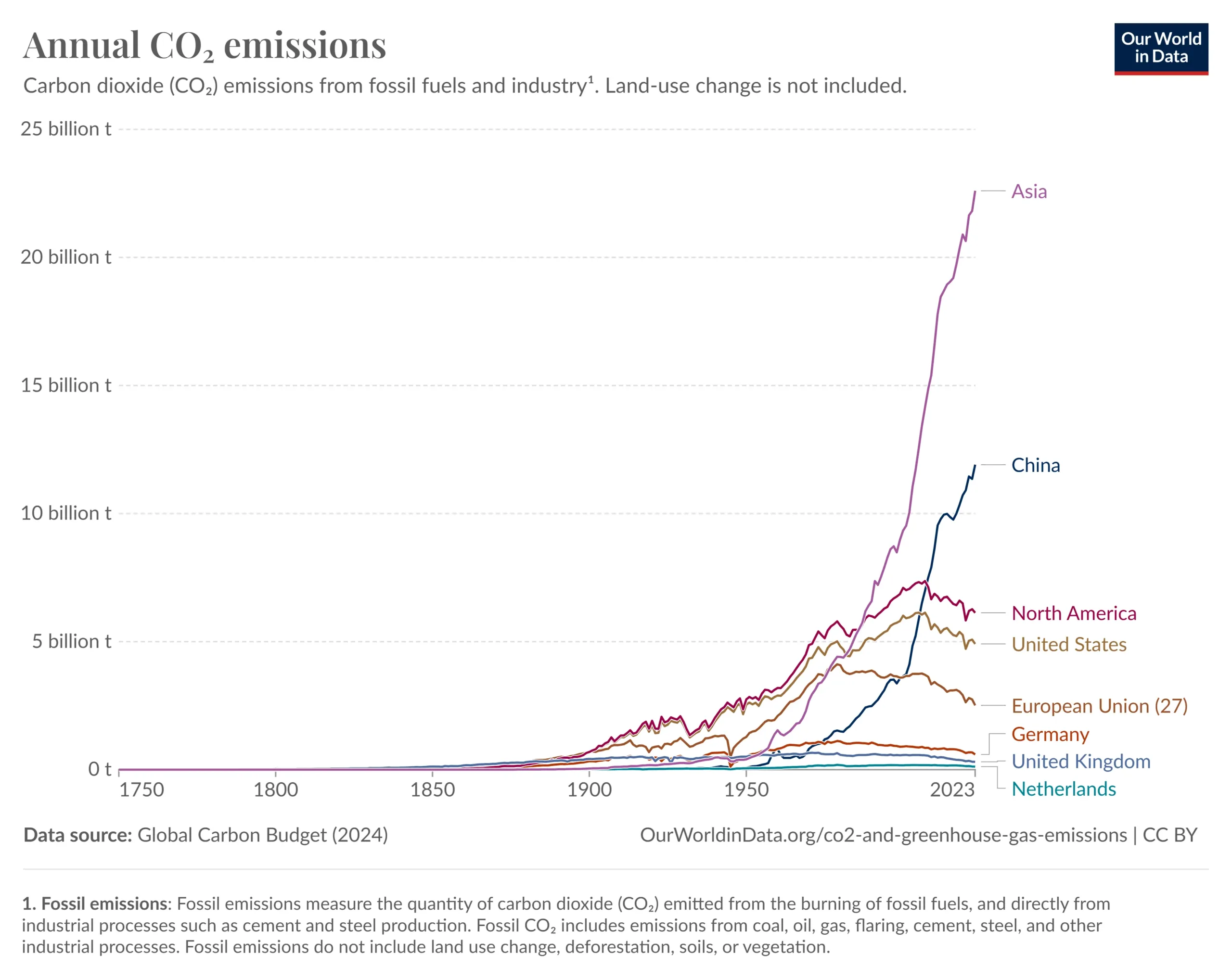 Met dat gegeven in het achterhoofd, laten we eens kijken naar de afbeelding bovenaan dit artikel. We zien hier de CO2-uitstoot van een aantal grote landen zoals China en de Verenigde Staten, maar ook Azië als geheel, Noord-Amerika en de Europese Unie. Het internationale klimaatbeleid begon in 1992 met het klimaatverdrag van Rio. De totale CO2-uitstoot van Azië bedroeg op dat moment 7,2 miljard ton. De jaarlijkse onderhandelingen (de zogenaamde COP’s) om de CO2-uitstoot naar beneden te krijgen begonnen, maar jaar na jaar zien we de uitstoot van Azië juist stijgen, de laatste jaren zelfs steeds harder. In 2023 stootte Azië maar liefst 22,6 miljard ton CO2 uit, meer dan drie keer zoveel als in 1992! Nederland is een klein land en draagt logischerwijs weinig bij aan de wereldwijde CO2-uitstoot. Als we niet alleen naar CO2 kijken, maar naar alle broeikasgasemissies bij elkaar opgeteld, dan is Nederland verantwoordelijk voor ongeveer 0,3% en de EU als geheel voor 6%. China neemt 30% voor haar rekening en de VS ruim 11%. China stoot dus 100x zoveel uit als Nederland en dit betekent bijvoorbeeld dat op 4 januari van een jaar China alweer net zoveel heeft uitgestoten als Nederland in dat hele jaar zal gaan doen.