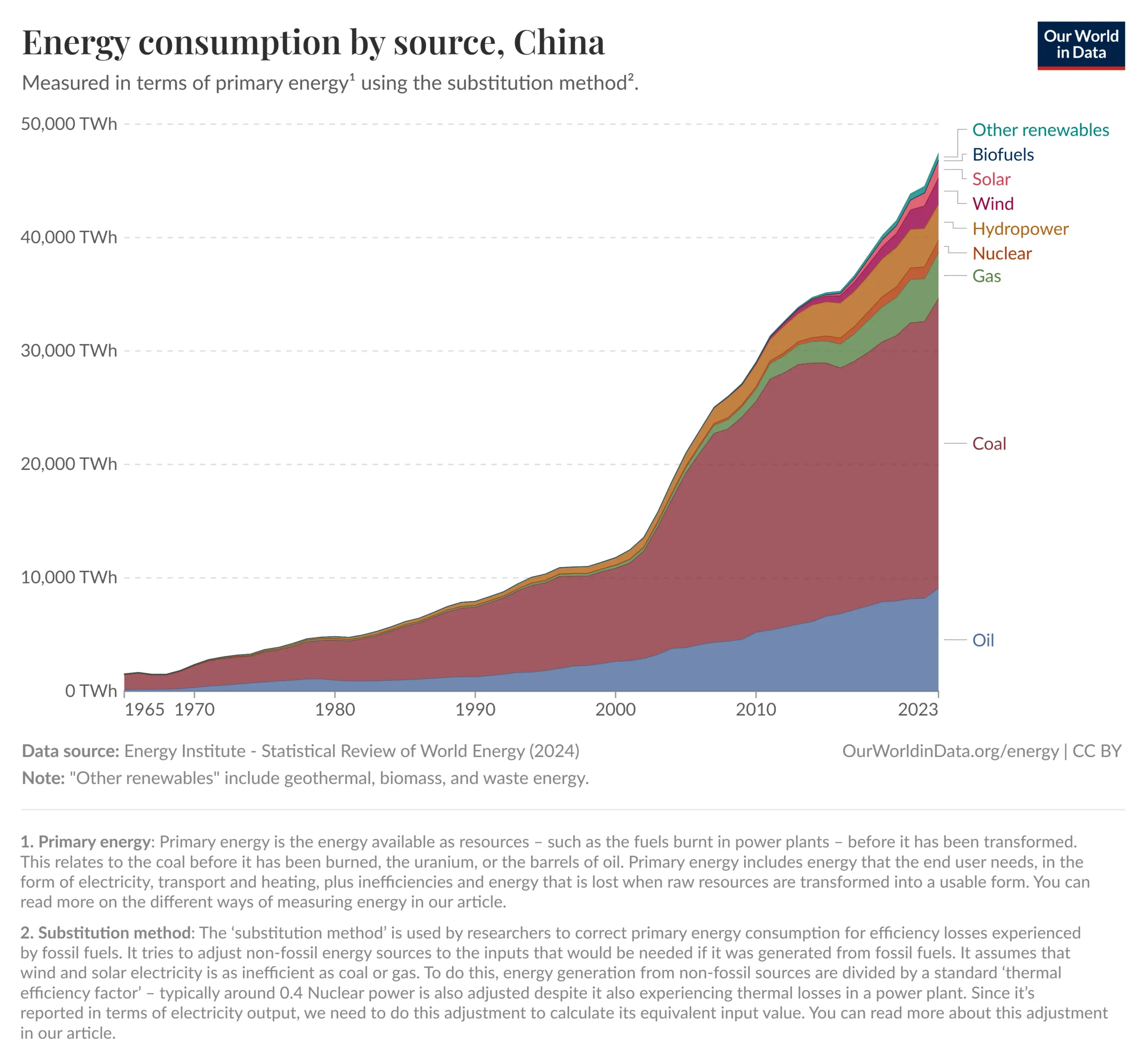 In de figuur hierboven zie je hoe snel het totale energieverbruik in China stijgt. Het sterkst stijgen het gebruik van steenkool (waarover China in ruime mate beschikt), aardolie en aardgas. Maar China is toch ook wereldkampioen als het om de installatie van zon en wind gaat? Dat klopt helemaal, alleen komt die groei niet in de buurt van de groei van fossiele brandstoffen. De vraag naar energie groeit zo sterk in China dat ze alle bronnen nodig hebben. Zo groeit kernenergie in China ook harder dan in welk ander land dan ook.