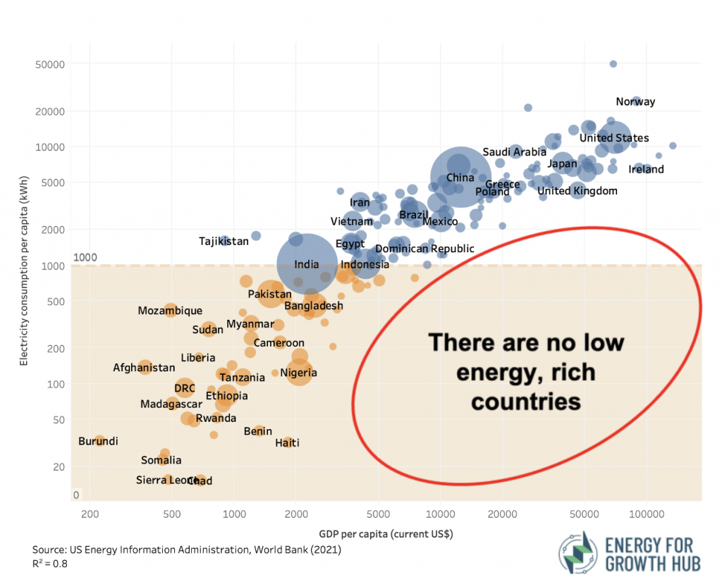 Dat brengt ons bij een andere kwestie. Willen de landen nou echt niet meer hun best doen om CO2 te reduceren of kunnen ze gewoon niet. Om die vraag te beantwoorden moeten we naar de relatie kijken tussen energie en welvaart. Ook die relatie is weer heel simpel. Rijke landen gebruiken veel energie, arme landen weinig. Er zijn geen uitzonderingen.