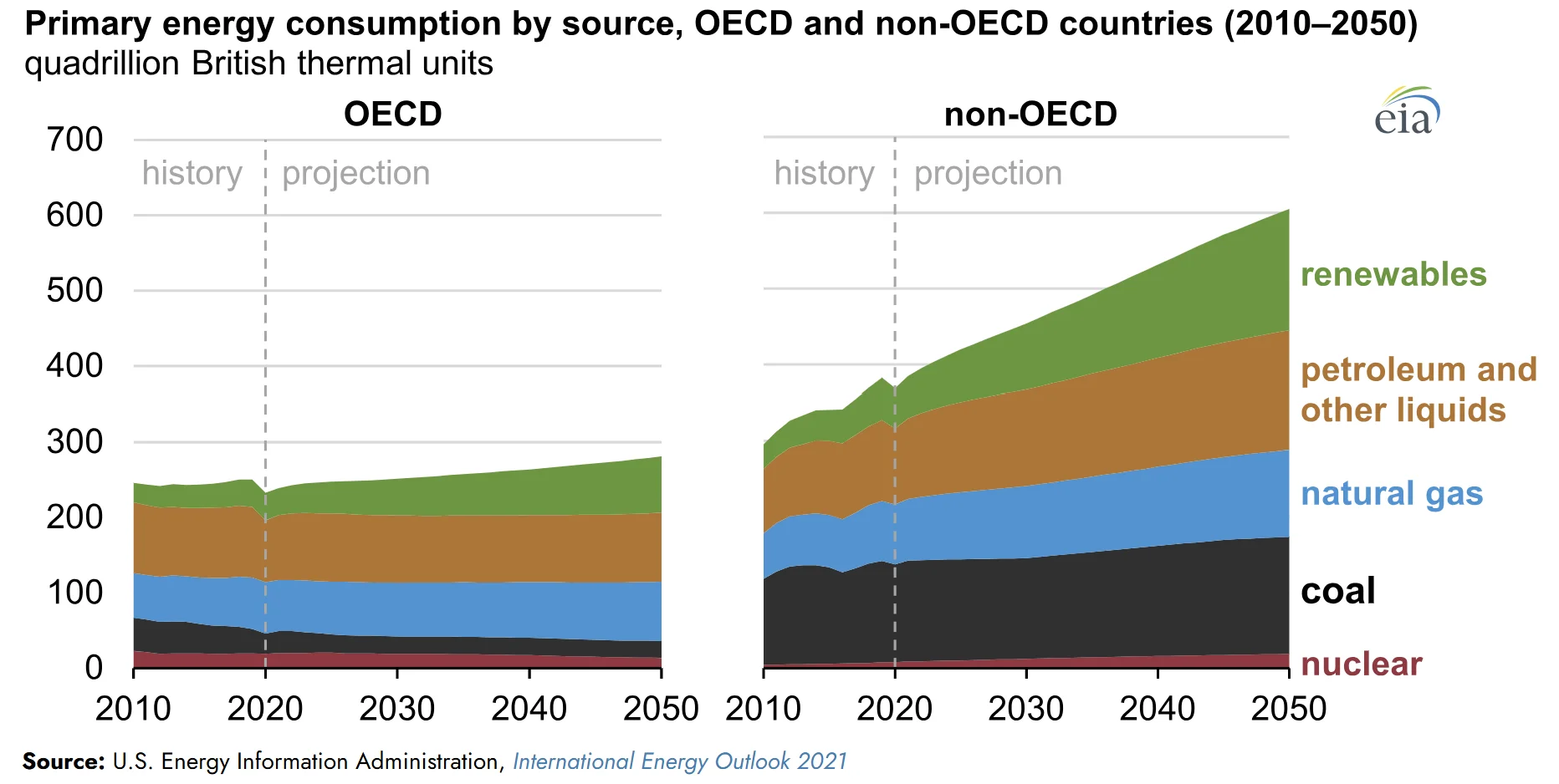 China en India schuiven langzaam op naar de welvarende landen rechtsboven in de figuur. Alle landen in de wereld willen dit (wie zijn wij om hen die welvaart te ontzeggen?) en zoals het voorbeeld van China laat zien gaat dat gepaard met een forse groei in vrijwel alle vormen van energie, dus ook fossiel. En dus zal de komende decennia de wereldwijde energievraag blijven stijgen. Die groei vindt volgens onderstaande prognose van de Amerikaanse Energy Information Administration vooral plaats in de landen die niet zijn aangesloten bij de OECD.