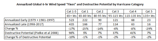 Nu zien we plots beter wat het werkelijke verschil is tussen de vroege en de late periode. Het aantal observaties is in alle categorieën afgenomen! Maar de afname is het sterkst in categorie 1, 2 en … 5! Dat laatste is natuurlijk helemaal opvallend omdat de paper claimt dat er een verschuiving is naar zware orkanen. Kent vermeldt in bovenstaande tabel ook de gevolgen die de veranderingen konden hebben op de wereldwijde schade. Een studie van Roger Pielke Jr uit 2008 wees uit dat categorie 3 en 4 orkanen wereldwijd verreweg de meeste schade veroorzaken. Categorie 5 is uiteraard het meest destructief maar komt relatief weinig voor. De data van Kossin suggereren dat de schade door alle categorieën moet zijn afgenomen in de latere periode ten opzichte van de eerdere periode.