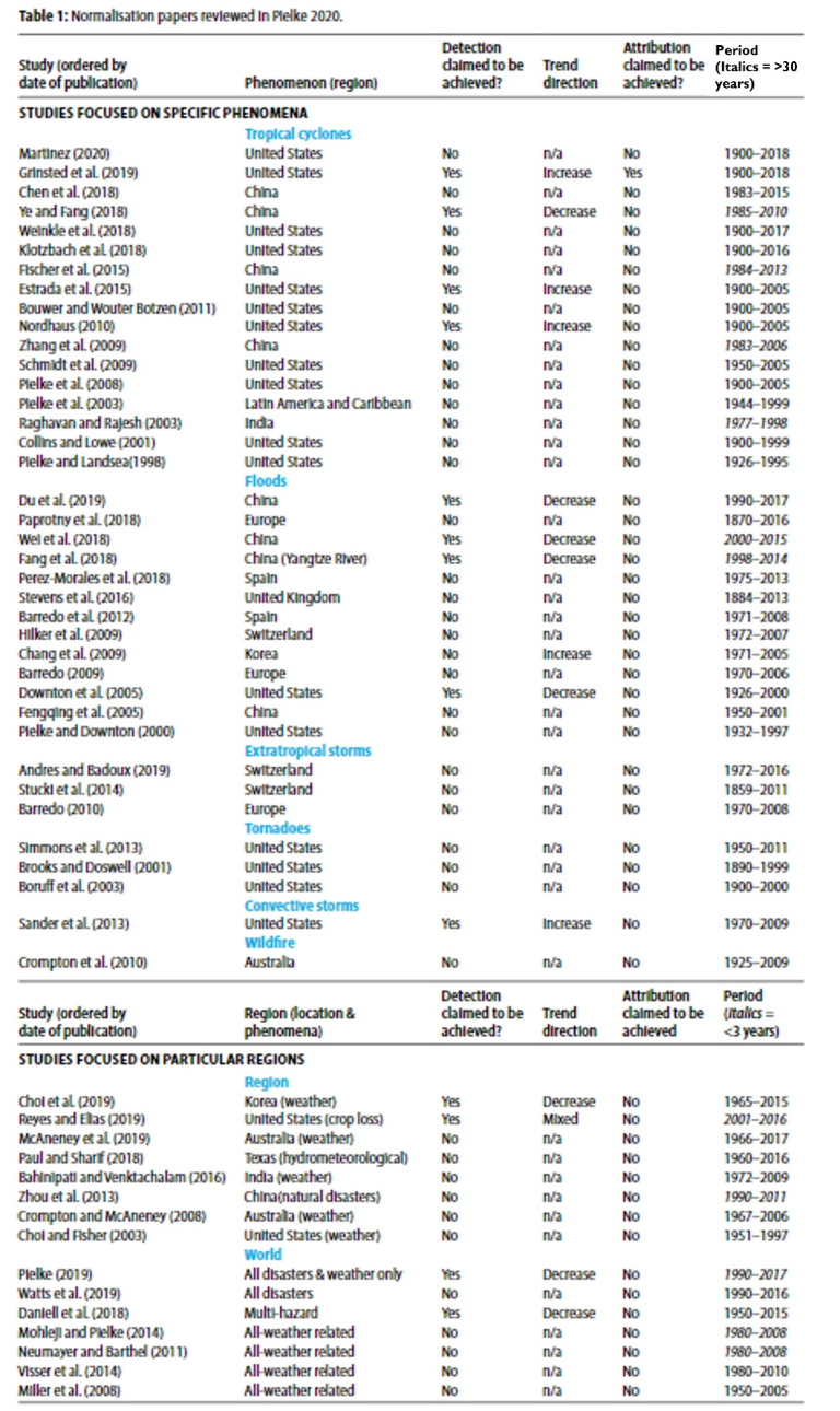 De tabellen die Pielke in zijn overzicht uit 2023 publiceerde, met name de samenvattende normalisatietabel (zie hieronder), tonen aan dat voor orkanen, overstromingen, stormen buiten de tropen, tornado’s en bosbranden de meerderheid van de peer-reviewed studies geen trends in genormaliseerde verliezen rapporteert en geen toeschrijving aan broeikasgasemissies.