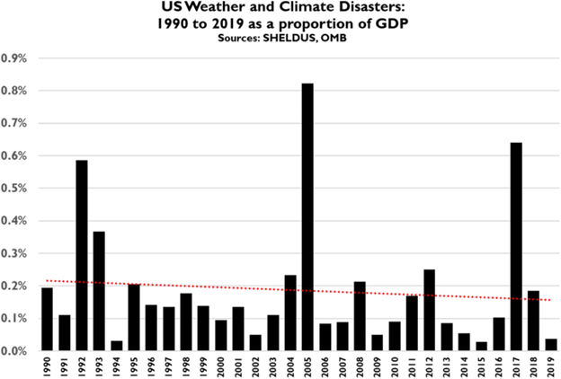 Waargenomen genormaliseerde rampverliezen ondersteunen niet de bewering dat de Verenigde Staten als enige “meer betalen dan enig ander land” als gevolg van klimaatverandering. De toename van economische verliezen in de loop van de tijd wordt overweldigend verklaard door de groei in welvaart en blootstelling.