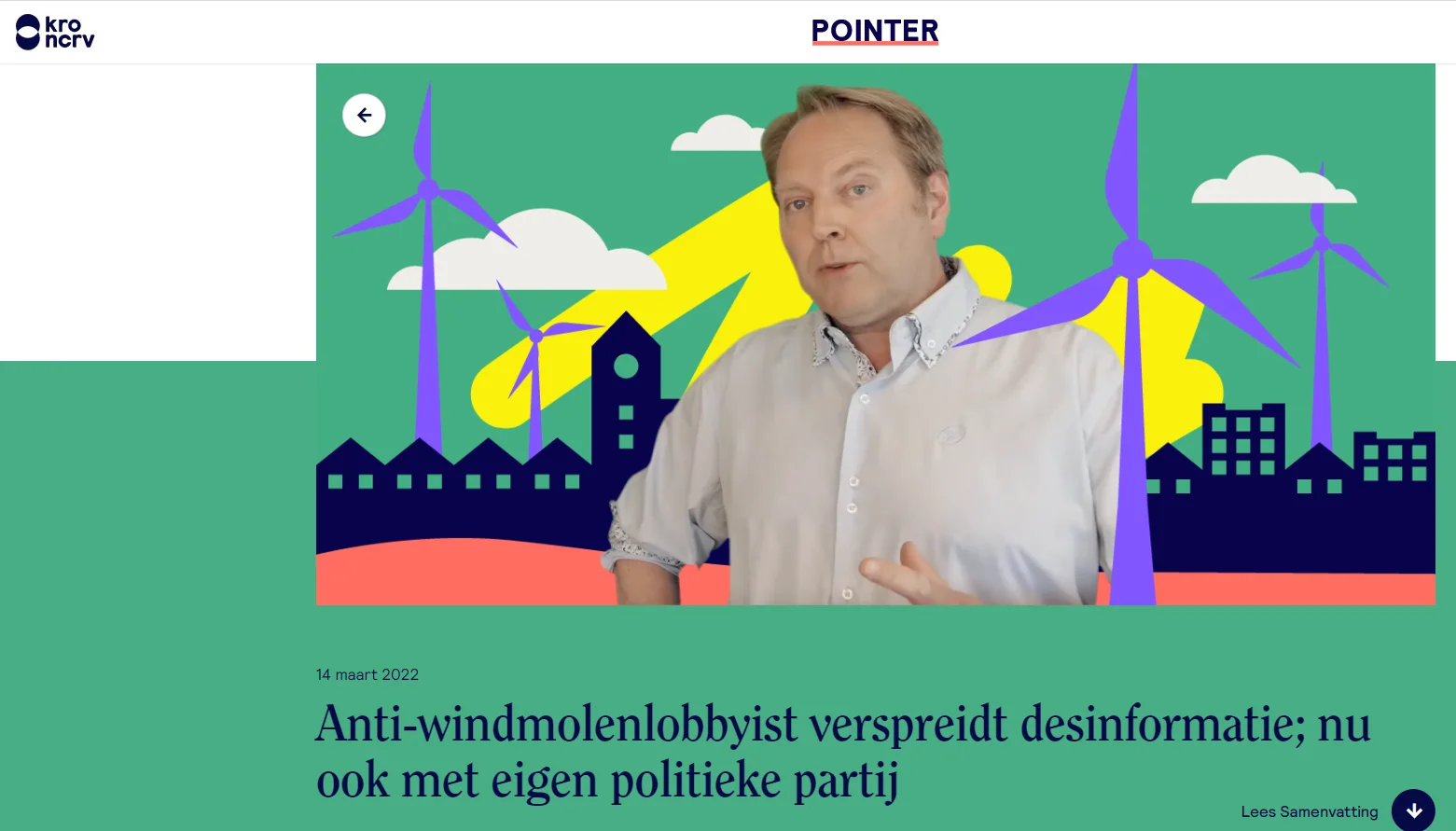Zoals we eerder aantoonden (hier en hier) deed KRO-NCRV programma Pointer in haar ijver om Clintel en RES in Beeld zwart te maken aan ‘liegen en bedriegen’. Drie tweets die niets met discussies over windmolens te maken hadden (maar met kerkbezoek en het sinterklaasjournaal) werden gebruikt als ‘bewijs’ tegen de website RES in Beeld. Het idee zou dan zijn dat foto’s van RES in Beeld zouden hebben geleid tot ophef onder burgers wat weer zou hebben geleid tot online ‘bedreigingen’ richting een wethouder in Wijk bij Duurstede. Ook toonden we aan dat de beschuldiging van boer Peter van Rooijen, die ons beschuldigde van “liegen en bedriegen”, kant noch wal raakte. RES in Beeld heeft nooit visualisaties gemaakt van het erf van boer Peter en hij wil helemaal geen molen in het kader van de RES (molens met een hoogte tot wel 240 meter tiphoogte) maar een agrarische molen met een tiphoogte van slechts 23 meter. Deze casus werd er dus met de haren bijgesleept door Pointer zonder de kijker daar duidelijk over te informeren.