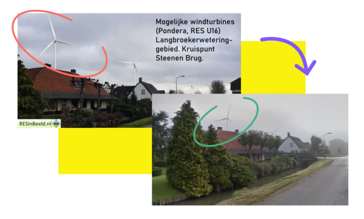 Linksboven de afbeelding van RES in Beeld, rechtsonder de volgens Windplanner ‘correcte’ weergave. Bij RES in Beeld zijn drie windmolens te zien, bij Windplanner is de derde niet meer te zien. Tevens zijn de molens bij Windplanner inderdaad kleiner dan bij RES in Beeld.