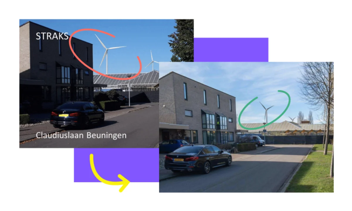 Op het eerste gezicht lijken de twee foto’s min of meer hetzelfde maar als je iets langer kijkt, met name naar de posities van de molens dan vallen verschillen op. De eerste molen bij RES in Beeld staat duidelijk links ten opzichte van de lantaarnpaal die naast het huis staat, bij Windplanner is dat iets rechts van die lantaarnpaal. Rik Wouters, betrokken bij Stichting Tegenwind in Beuningen (zij strijden al meer dan tien jaar tegen windmolens in de gemeente, op dit moment loopt er een procedure bij de Raad van State), was de contactpersoon van RES in Beeld in Beuningen. Hij laat per e-mail weten dat zij de eerste molen op 800 meter afstand wilden plaatsen. Het lijkt erop dat die van Windplanner op iets van 1000 meter afstand staat. Verder weg en dus kleiner op de foto.